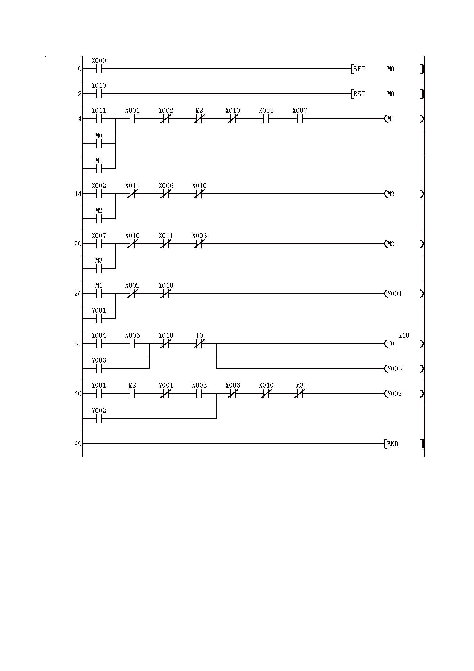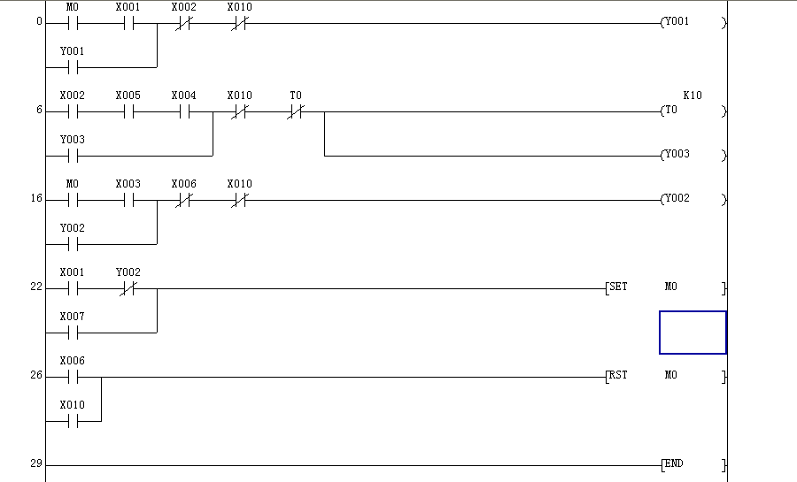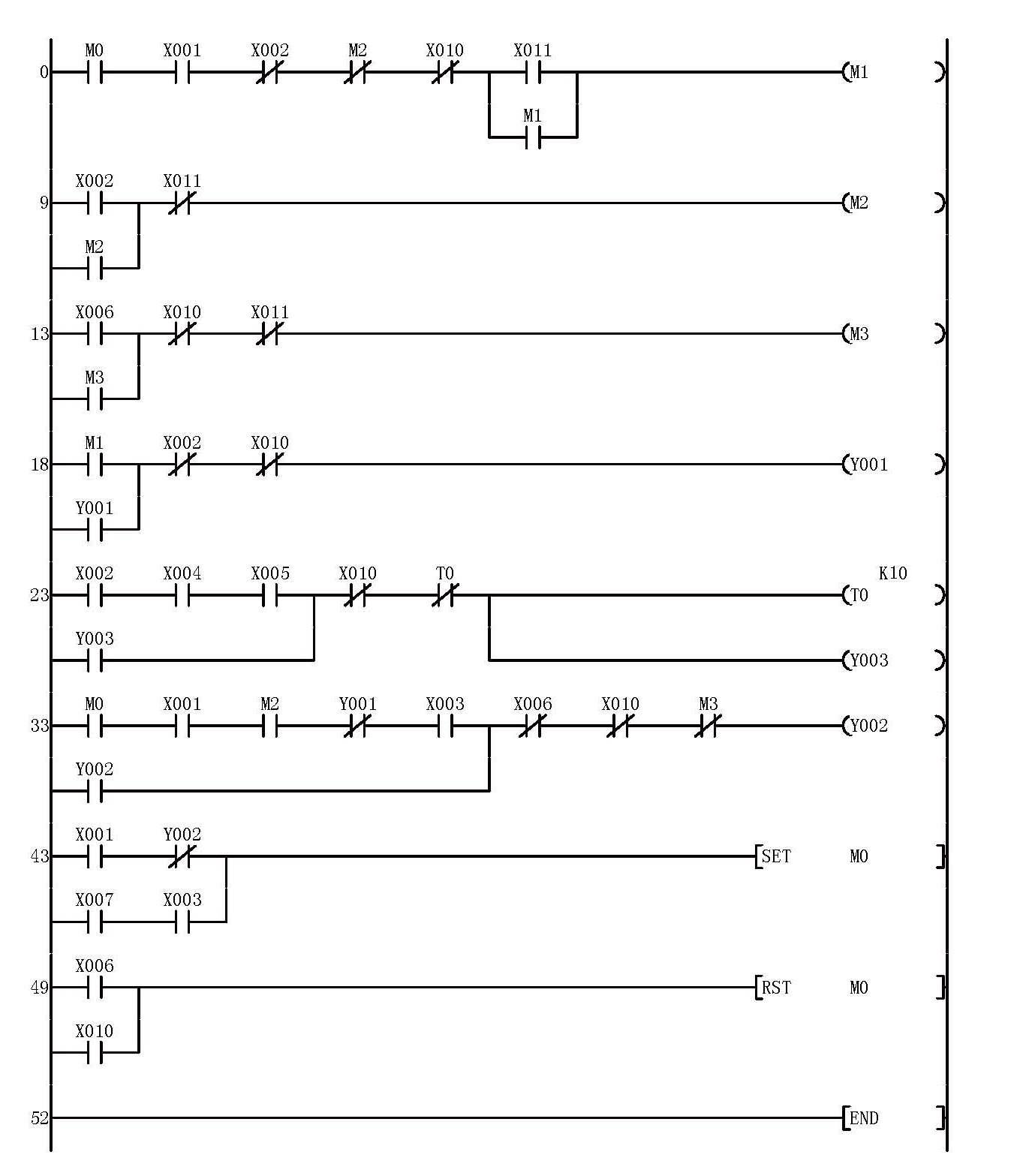 补充:接近开关X001感应材料到位后气缸Y001得电吸合,但材料并没有离开,即有料到位后X001处于长通状态,直到Y002得电接通后才X001断开.