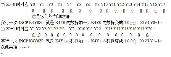 你上面MOV ZO K4Y0的解释我能看的懂。 就是底下INCP K4Y0Z0的解释不是很清楚,为什么Z0=0,对应Y0~Y17,输出全灭,Z0=1对应Y0~Y17,Y0接通,Z=2对应Y1~Y20,Y1接通,Z=3对应Y2~Y21,Y2接通,因此每接通一次就多一个输出点接通,之前的输出点不灭,变化应该是1.3.7.15。。。。。,,,,,, Z0值的不同,(对应 Y0~Y17,Y0接通,对应Y1~Y20,Y1接通,对应Y2~Y21,Y2接通)Y的对应也不同,Z0=0和=1时,都是对应的Y0~Y17。还有