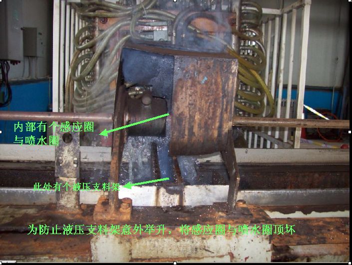 感应圈与喷水圈紧靠在一块,下面就是一个液压支料架,为防止发生意外液压支料架举升后撞坏感应圈与喷水圈,特请教各位高手有何良策。谢谢!!!