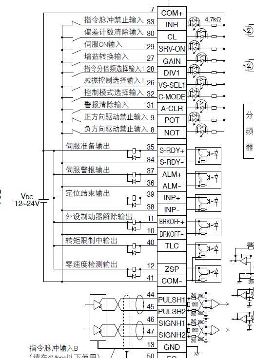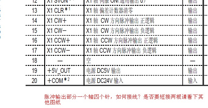 这个是基恩士H40S定位模块的输入输出接线图的一部分,看到与驱动器接线的图纸中间没有接电源,有可能是公共的,可是例如“伺服就绪”、“伺服结束”“Z相"之类的用的是5V电压,为何又这样接呢?针对说明书我有些怀疑,脉冲输出部分要求也是5V电压,KV-1000主机可以接24V的,也可接5V,问了客服似乎也不确定这个只是说能与伺服接线。 看到一般伺服只有12V和24V的集电极开路的接入方式,没有5V的,直接接针对这个我有些怀疑。 接的是松下伺服,驱动器输出分正负,看到说明书只接了一根,应该每一个另一根负接OV才对。 把驱动器的输出接到定位模块输入似乎要电压,看说明书似乎另外要加电源。每个轴四个针号,是否要把负逻辑部分短接0V。[ 此帖被gali1120107在2011-11-10 17:05重新编辑 ]