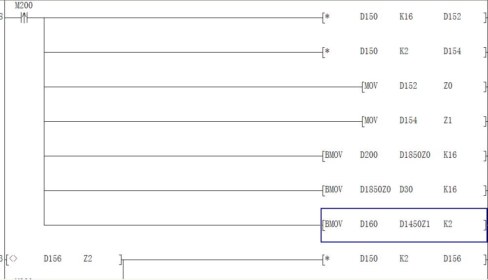 我现在用Q01的CPU,现在有一个问题,看图1,D150是程序编号,D160是产品型号,有不同型号的产品,将不同型号产品的初始位置值保存下来,我是用变址来写的,如果用输入程序编号(1,2....)来搜索对应保存的数值和产品型号是可以的,但现在客户要求通过输入产品型号(例如8876,9876....等。。产品型号是一串数字,没有字母)来搜索预先存储好的数值和程序编号。。。比如程序1对应的产品型号是4564,有8个初始位置值预先保存在里面,程序10对应产品型号8988,也有8个初始位置值预先保存在里面,你输入4564,按个搜索按钮,就可以调出相对应的程序1和预先保存好的数据。图2是所写的程序(D200开始的16个寄存器是人机上的值,需要保存调用,D30是程序里要用的值,与D200对应),请大家帮忙看一下,这样的程序要怎么写,头大啊