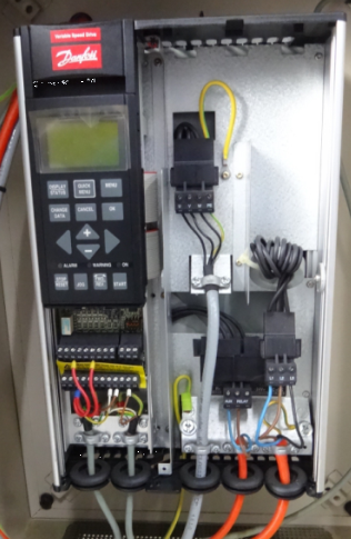 我要说的是,公司之前在瑞士买的一台机器,控制系统大概是用单机片(或者是上位机)--我之前有发过图片。我不知道到底是那一种。,,,因为这台机器效益太低,准备改造用三菱PLC控制,程序重新写。 我去检查它控制电路,发现四个小电机马达,只用一个变频器控制(前面说的加四四个交流接触器完成)。 变频器品牌是{丹弗斯的) 如图