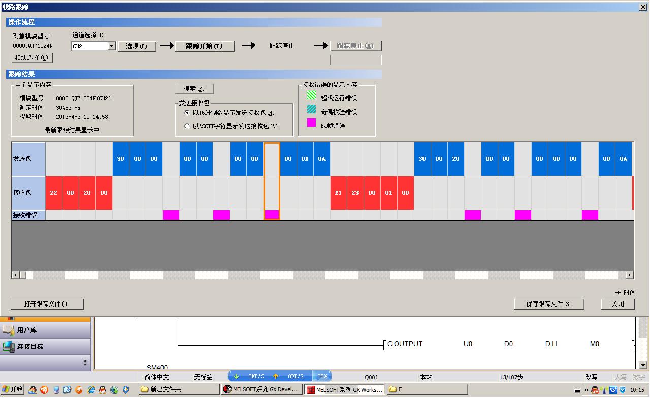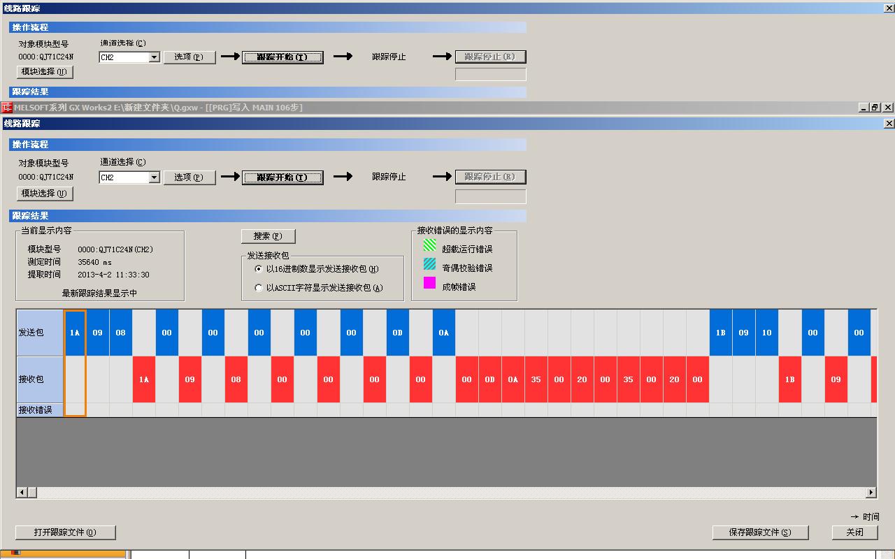 OK.现场试太麻烦,所以现在回到公司试,QPLC是Q00J搭QJ71C24N,现场是Q02U,这个应该问题不大,另一边是3U搭3U-485-BD,线路是使用两线制(Q:RDA和SDA短接跟3U:RDA和SDA接,Q:RDB和SDB短接跟3U:RDB和SDB接),现在的问题是两个PLC运行通常一段时间后出现成帧错误,错误代码是7F68。之后数据就开始乱发乱收。乱一段时间又正常了。这到底是什么原因啊!