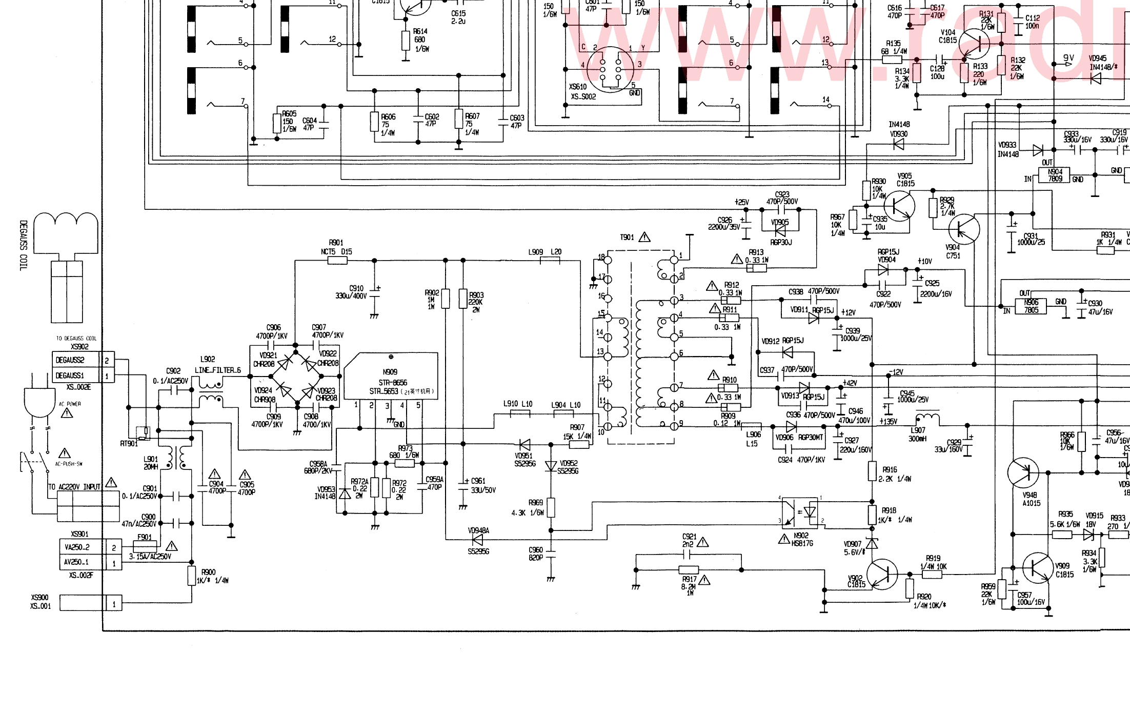 在指示灯为黄色的状态下,可以看到显像管管口处的灯丝亮了,但三无。此时测电容C910两端有285V电压,C927两端直流电压正为141V, 再测VCT 3801A 的各脚电压正常:3、7、15脚:5V,25脚3.3V,54:3.3V,58:4.8V,59:3.1V ,60:3.5V,61:4.9V。