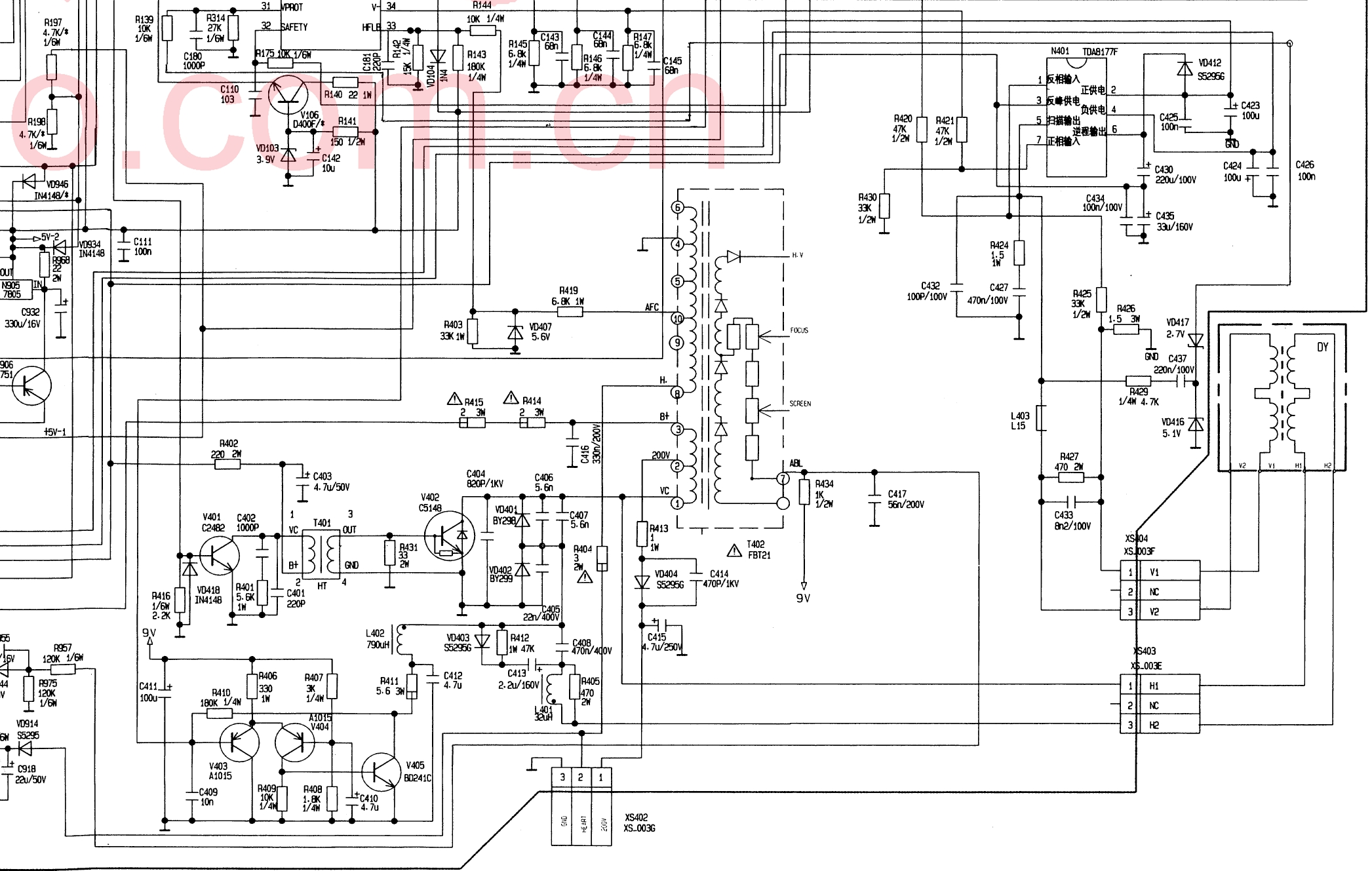 昨天没有修,因为去购材料了,我现在将VCT 3801A 更换了,再将原来的行管V402(图中C5148)进行更换为D2901(不知这个管子是否可替换?),现在VCT 3801A 开机后不烫了,证实它确实已经损坏,但依然是三无。测行管V402 D2901 b、e直流电压为0V(不知是否正常?),c为143V。