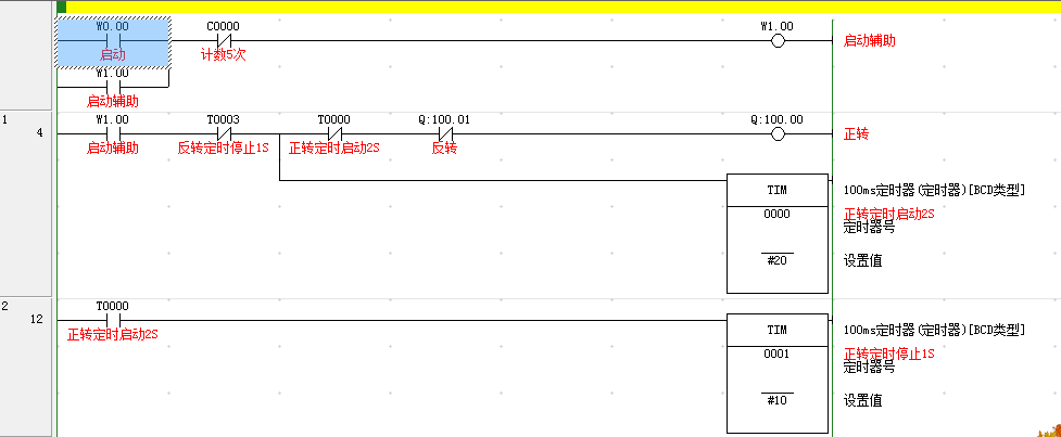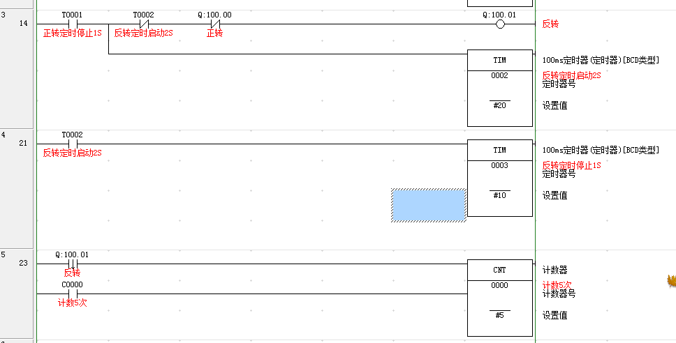 引用引用第11楼杨粟宇于2013-08-21 12:07发表的 :你这个程序有问题的,首先C没有在停止的时候清零,会造成第二次启动的时候立即停止。其次你用来给C做计数的信号不对,即使你上电第一次启动,在第五次循环的时候正转刚起,电机都还没转,就停止了,更不用说反转了。如6楼所说用Y1,如果还是上升沿,那么也会产生第五次循环时正转后不反转的现象。上面说的很对,应该用Y2的下降沿,C要有复位