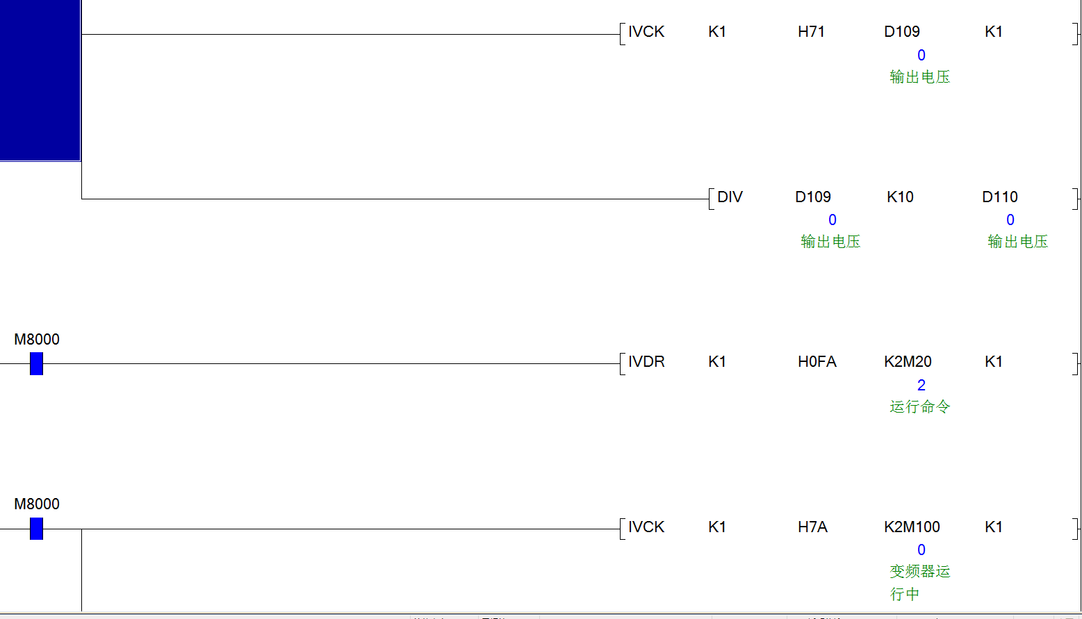 三菱PLC与三菱变频器通讯中可以控制变频器的启停.频率写入,当变频器运行中读出的电压值.电流值都为零,请教大神原因!