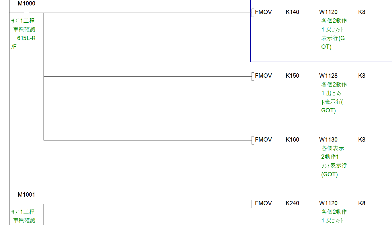 各位大神,现用三菱触摸屏,注释显示用字地址显示,原程序FMOV K140 W1120 K8,可正确显示指定注释组140-148.现追加一个页面,追加程序 FMOV K1040 W11A0 K8 ,W11A0-W11A7八组注释全显示1040。和软元件存储器设定的数据有关吗?