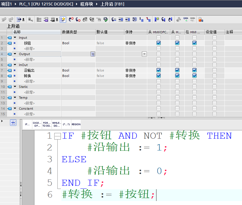 在FB1 做了个上升沿 当按钮信号由0变1时 沿输出一个扫描周期 不知是不是你想要的 S7-1200有现成的指令
