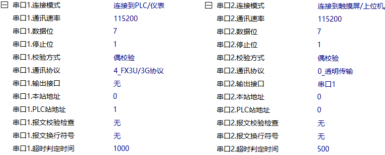 IGT-SER系列智能网关的串口1连接PLC,串口2连接触摸屏,智能网关模块的相关参数设置如下: