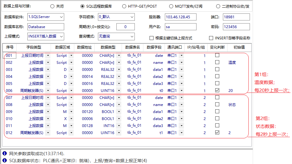 IGT-SER系列智能网关模块,支持各种PLC、智能仪表、远程IO与数据库之间双向通讯,既可以读取设备的数据上报到SQL数据库,也可以从数据库查询数据后写入到设备;数据库软件支持MySQL、SQLServer、PostgreSQL。相关软件和手册在附件中。