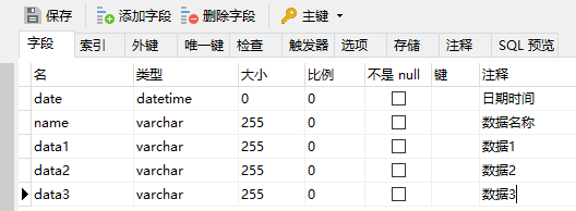 本案例中FX3G的PLC编程口就是被触摸屏占用了,通过IGT-SER智能网关模块按照上图实现与PLC和触摸屏同时通讯,将PLC寄存器的数据分两个组,按不同的周期分别上报到SQLServer数据库。首先通过数据库工具软件Navicat连接数据库,建立好数据表tb_fx_01,如下图: