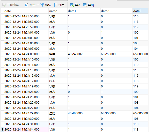 参数设置完成后通过‘参数’->‘参数写入到网关’将参数写入到网关模块,‘工具’->‘重启网关’,然后‘参数’->‘从网关读取参数’,在状态栏会显示网关的状态;如果状态正常,通过数据库工具软件Navicat连接数据库,查看数据表中的数据,如下图: