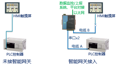 在PLC的通讯端口被触摸屏占用时,不用增加另外的通讯模块,按照以下方式直接加入IGT-SER系列智能网关模块,实现PLC与数据库双向通讯,具体原理如下: