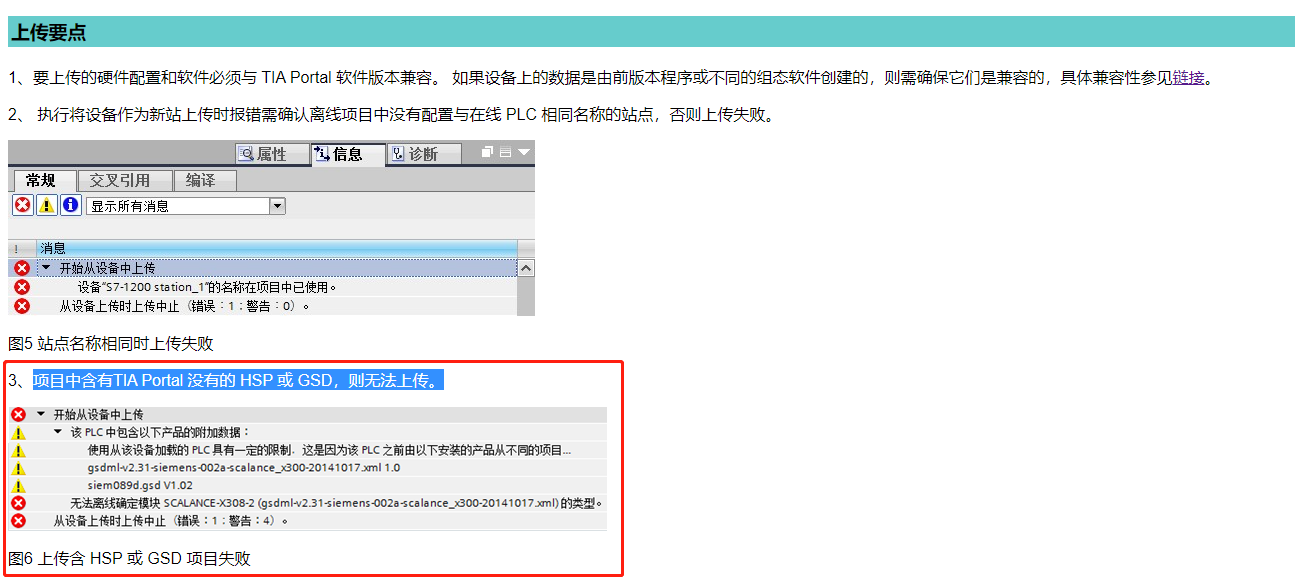 查了下官方解释:项目中含有TIA Portal 没有的 HSP 或 GSD,则无法上传。
