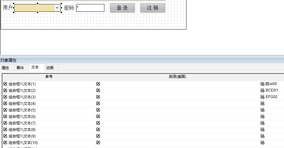 做出来的效果,就是在ComboBox的下拉列表中选中其中一个用户名【陈xx00、BCD01、EFG02】,然后点击登陆。前提是这些用户必须已经存在,且增加用户时,需要修改ComboBox的文本