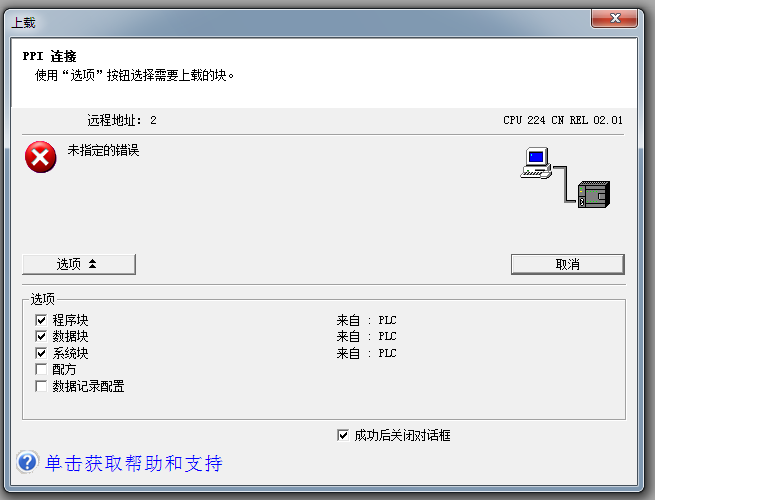几台设备用的是西门子S7-200,CPU224CN,现在有一台出现一个继电器触点粘连的现象。想重新编程换个通道。但是电脑联机上载程序进度完成后出现“未指定的错误”的提示。