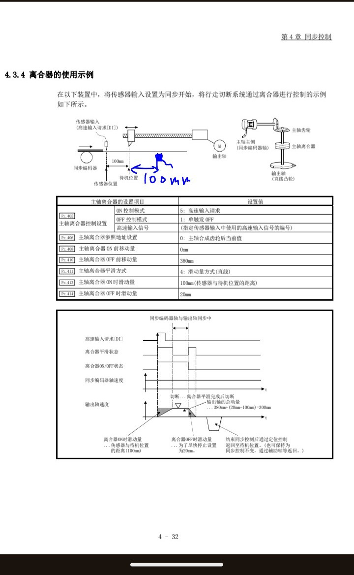 传感器安装在切刀待机位置之前100mm,通过设置pr413=100、切刀从0加速到和传送带速度相等时,切割点正好位于切刀下方。这种情况相当于是工件去追切刀