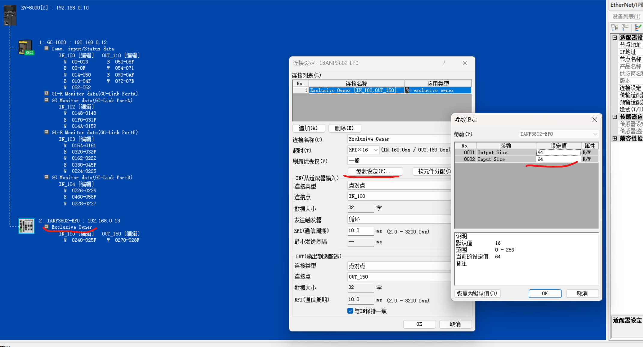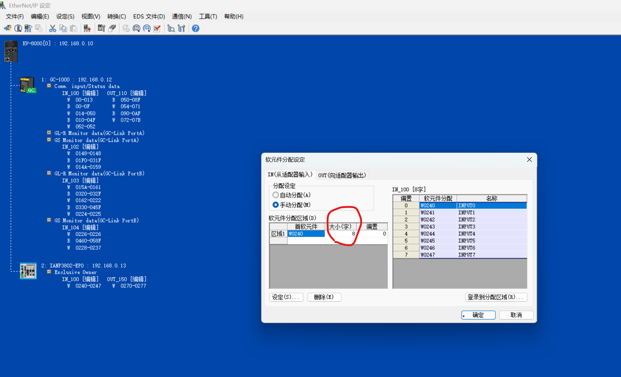 引用引用楼主gz068909于2025-10-26 05:13发表的 基恩士KV-8000控制IAI EIP通讯难题 :各位大佬早上好 小弟 第一次基恩士KV-STUDIO软件 PLC KV8000和IAI电缸网关RCON-GW-EP-FU1走EIP通讯但是在配置过程中,发现它这个软元件分配区域大小是固定8字,我重新安装了EDS文件也是同样的我想知道的是,因为我的电缸有3个,我是从W240起始配置的软元件,它需要排列到W26F才能结束.......