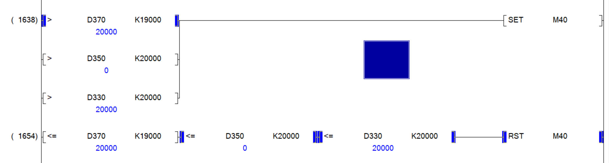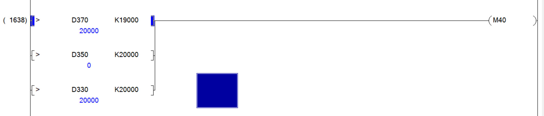 用到三菱PLCFX3U的,有D370,D350,D330三个寄存器,是面板上调节速度的,要求是这三个寄存器的参数不得高于19000,20000,20000.如果任何一个超过这个数,那么就报警,报警的线圈用M40,报警之后这三个数调节到小于或等于要求的这三个数值后M40解除报警。写了两种,监视着参数都不行,其他地方没用用到M40,只有这里用了,这里要么到断开条件不断开,要么到接通条件不接通,这是那里没写好。