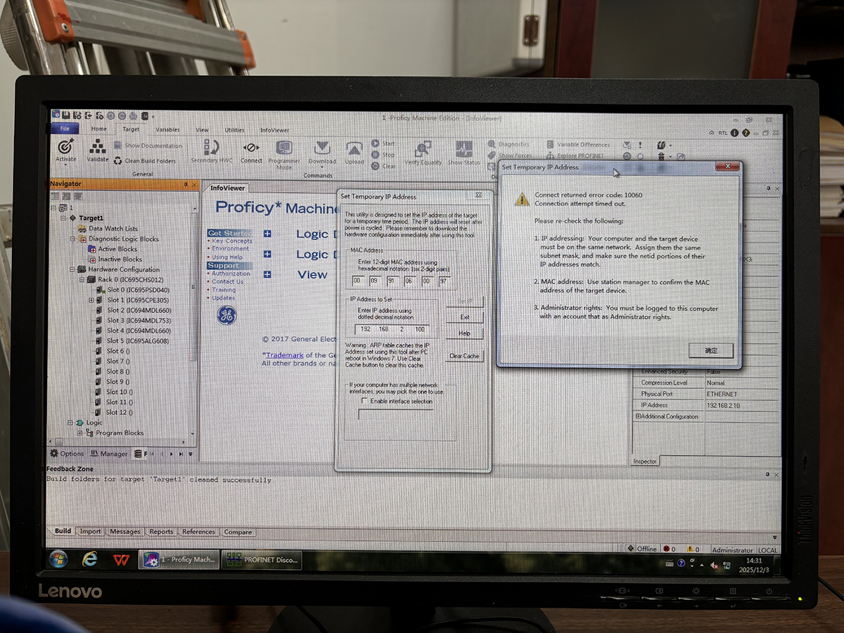 单位有一块老柜子上的PLC 拆下来 想学习PLC使用 可是下载了软件怎么都连不上 不清楚PLC的IP地址 用IP Scanner扫了几个网段扫不出来地址 网上查了怎么设置IP 可是如图报错