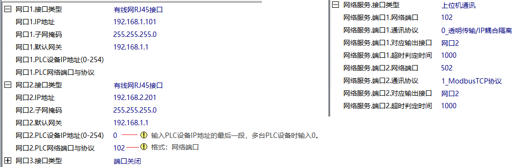 打开网关参数设置软件(在附件中),通过'功能'->'类型与设备选择'选择第三个类型,PLC设备选择西门子S7-1200/1500,点'确定当前选择'、'参数写入到网关',根据提示重启。重启读取参数后,确认跟之前所选择的一致,再通过'功能'->'网口参数编辑'编辑网口参数。以下是网关的网口参数配置截图: