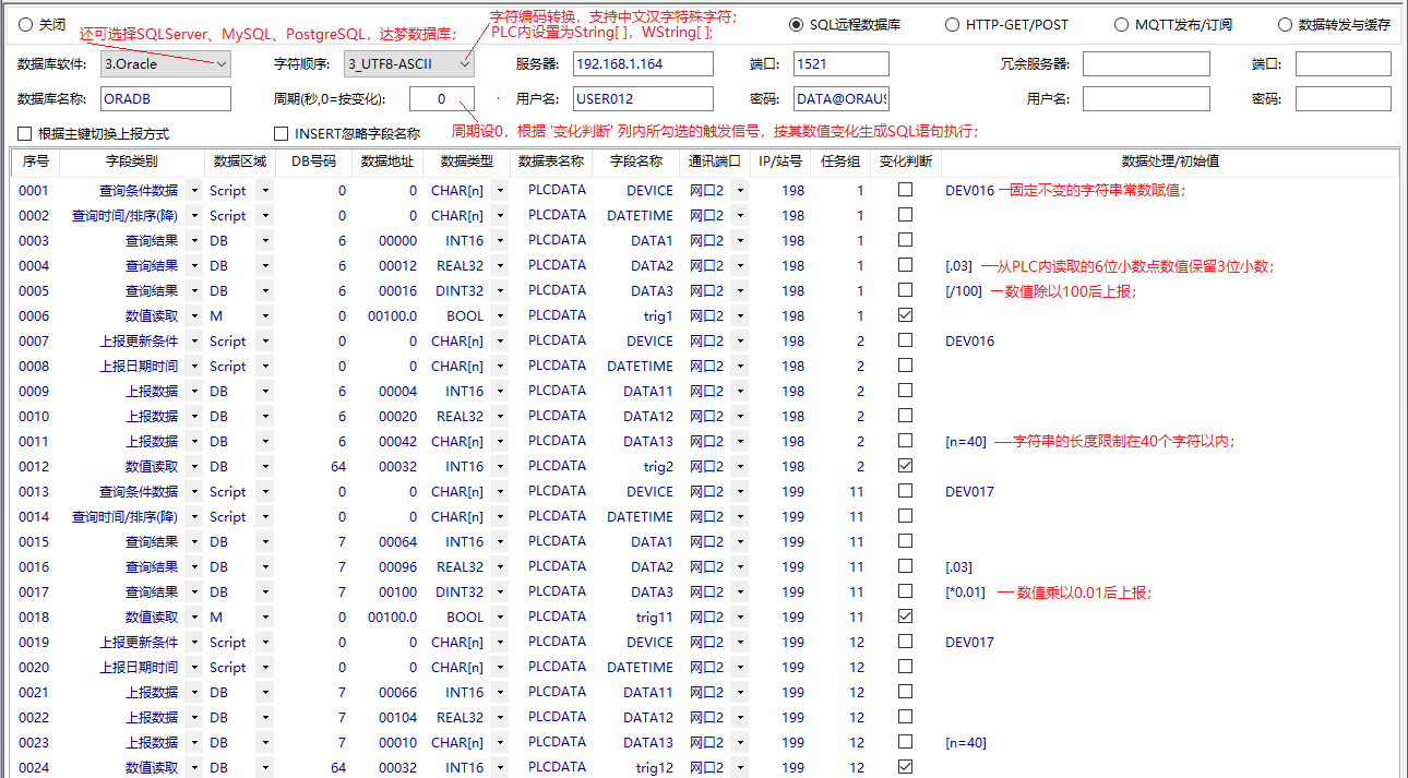 将参数后写入后重启(‘参数’->‘参数写入到网关’)、(‘工具’->‘重启网关’),读取网关参数(‘参数’->‘从网关读取参数’)后,看软件上显示的状态消息,根据状态消息调试。在‘工具’->‘网关数据监控’里面可以看到通过配置生成的SQL语句。
