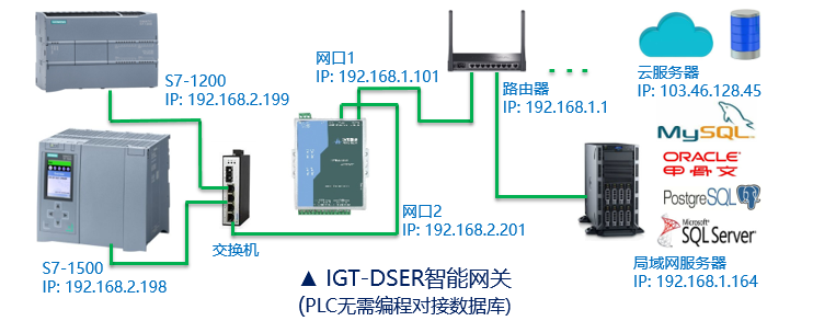 以下是通过数据库智能网关IGT-DSER实现S7-1200/1500系列的PLC与数据库服务器双向通讯,网关支持MySQL和SQLServer、PostgreSQL,以及Oracle、达梦数据库等。这里选择的是Oracle。实际网络结构如下图: