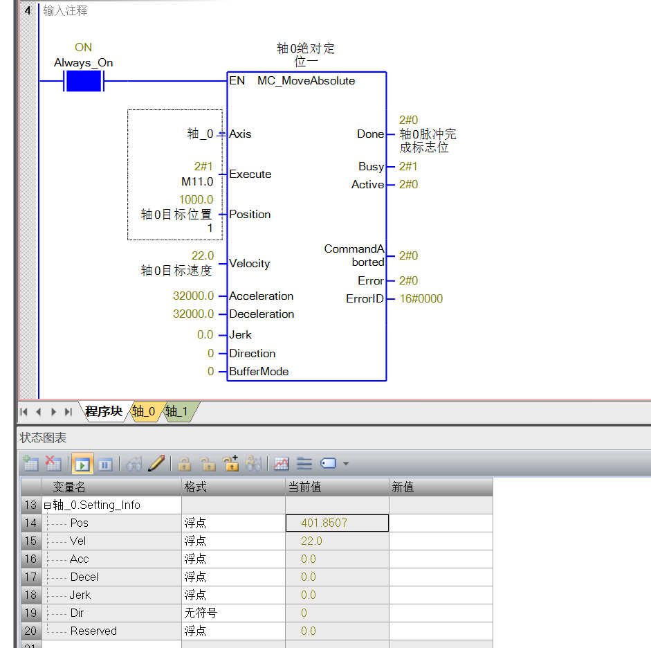 请教下我如何才能将这个轴_0的当前位置、当前速度的值存放进VD500、VD504寄存器里面,然后在触摸屏上面显示出来。