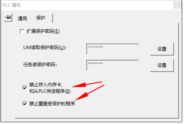 2、打开原有文件时,不知道是不是因为文件有设置保护密码,默认勾选上了,"禁止存入内存卡,和从plc传送程序(B)"和禁止覆盖受保护的程序“,如下图。取消勾选,保存工程后,再次打开,还是勾选上的。