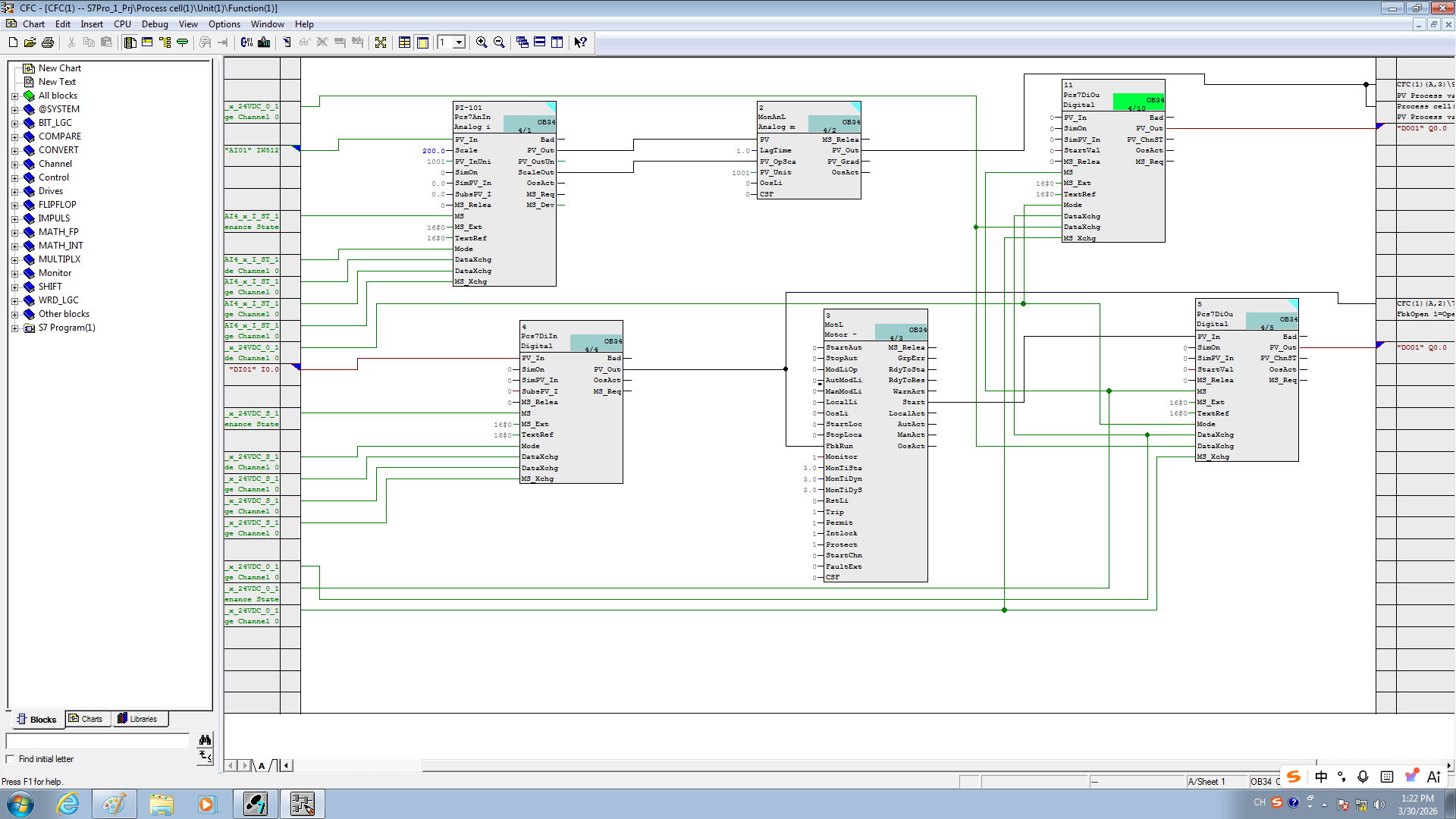 第七步,打开CFC进行编程。这种视图模式是DCS系统独有的。运用丰富的功能库组成对应的逻辑。本例是随意拖拽了几个。没有实际工艺含义。