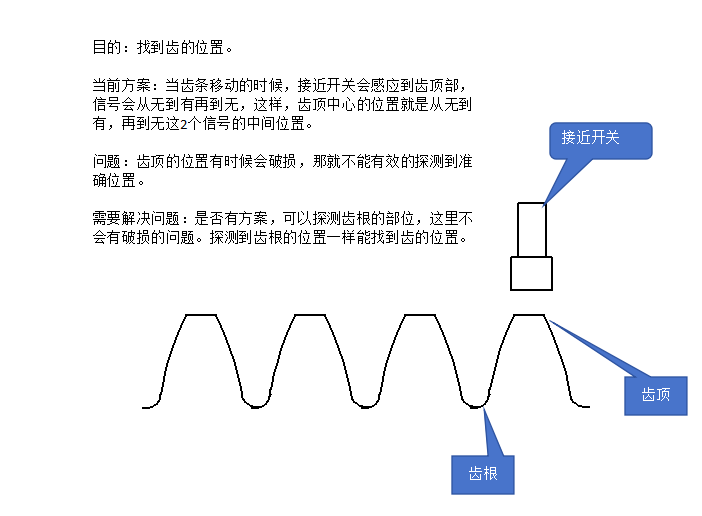 当前方案:当齿条移动的时候,接近开关会感应到齿顶部,信号会从无到有再到无,这样,齿顶中心的位置就是从无到有,再到无这2个信号的中间位置。