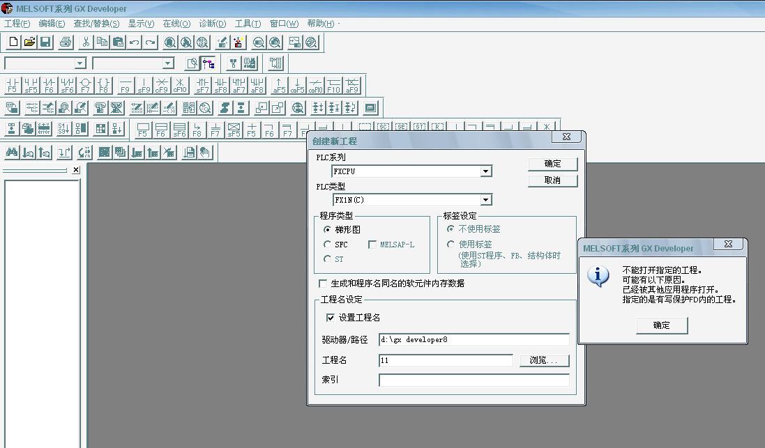 2、启动GX Developer8软件,新建工程失败,出现如下画面: 新创建工程失败画面
