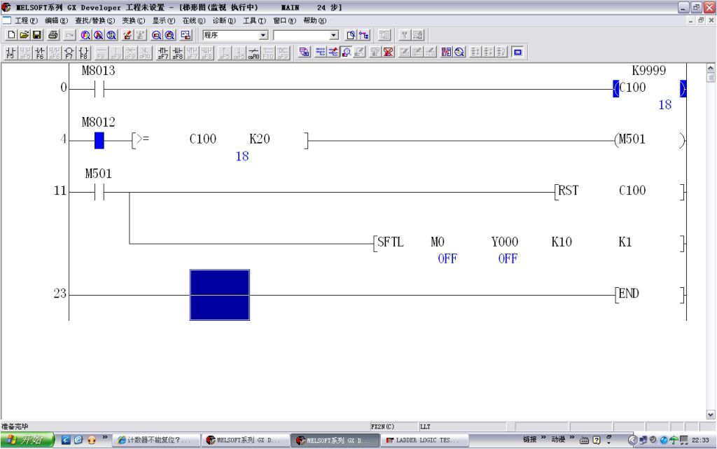 程序在仿真中运行没有问题,可是在CPU中计数器C100不能清零,还有为什么仿真中 SFTL 一下跳两个,从Y001到了Y0003。