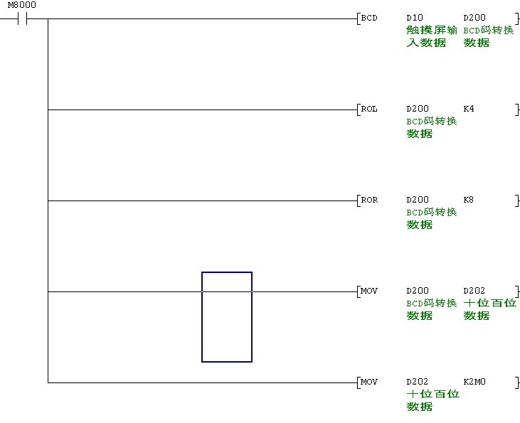 先把触摸屏过来的数据D20用BCD指令转换成BDC吗 存在D200中,然后左移4位,右移8位,在吧数据传动到D202中,在传送到M0-M7中