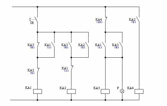 另一端接电源的地,再用JI 的一组常开触点与按钮K 并联。(2)、J2线圈一端接电源+,另一端串接J3 的常开触点,再串接按钮K,再