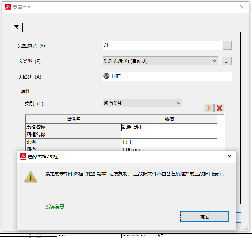 各位大佬 EPLAN在页属性界面 指定表格后报错:指定的表格和图框:"凯盟-副本" 无法复制。主数据文件不包含在所选择的主数据目录中。